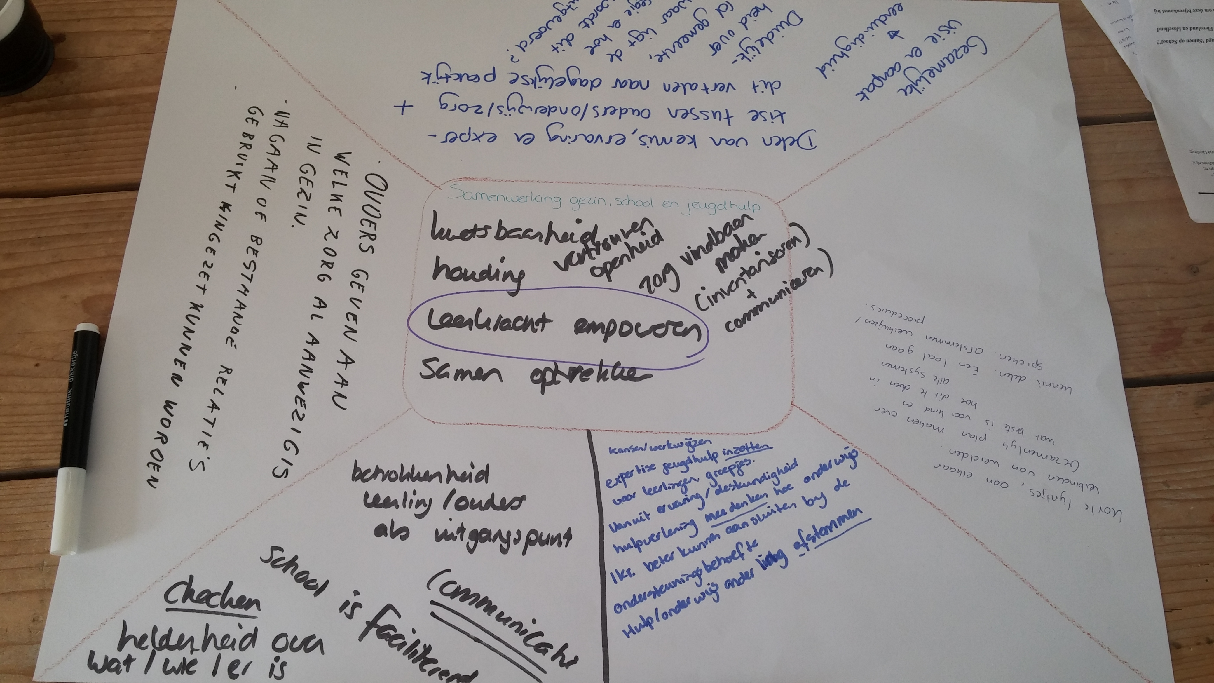 In subgroepjes gingen de deelnemers de discussie aan met elkaar: welke werkwijzen dragen bij aan een verbeterde samenwerking tussen ouders, jeugdigen, onderwijs en jeugdhulp? Wat gaat er al goed en wat kan beter?